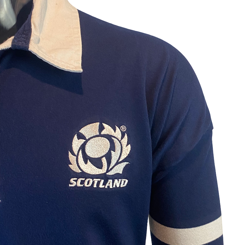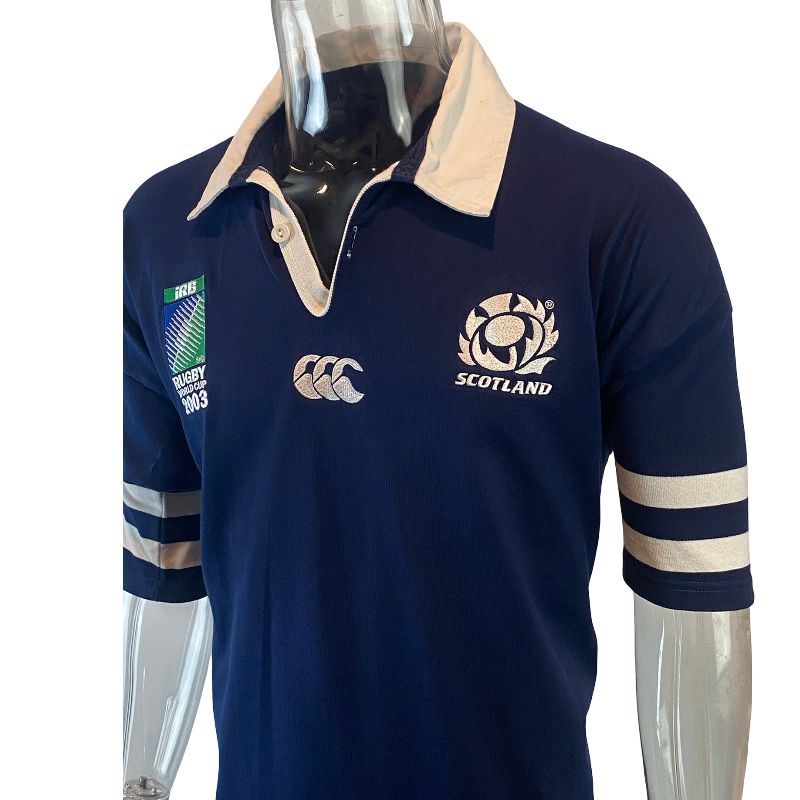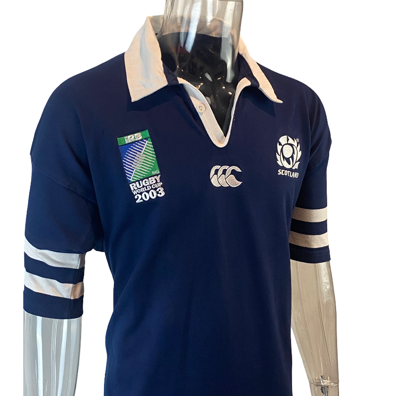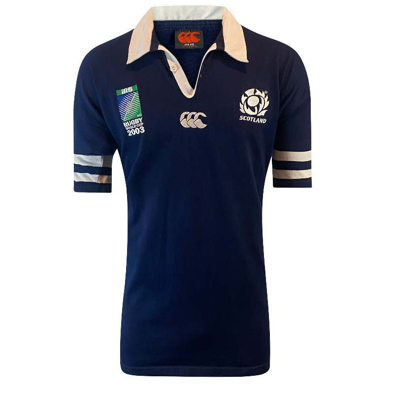 This 2003 Scotland Rugby World Cup jersey by Canterbury of New Zealand (Made in Australia) is a clean, sponsor-free international classic from one of Scotland’s most recognisable eras. Featuring the official Rugby World Cup 2003 sleeve patch and traditional navy colourway, it’s a timeless design that remains popular with both supporters and collectors.