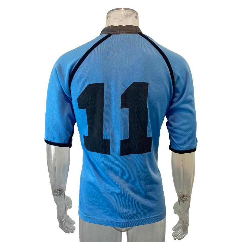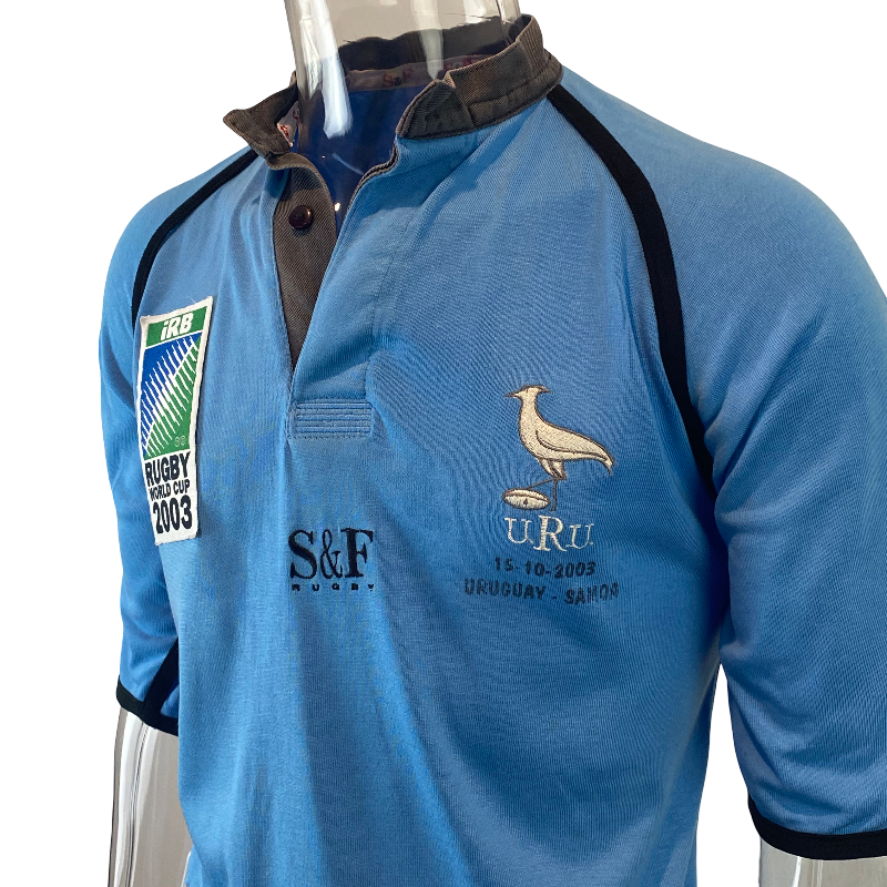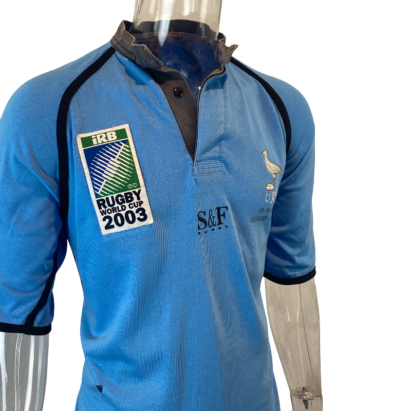 This 2003 Uruguay Rugby World Cup Jersey is a rare player’s jersey prepared for the historic tournament. Made for the match against Samoa, it features full match-day detailing, making it a unique piece of Rugby World Cup history. Due to a jersey clash, Uruguay had to switch to their black and blue alternate strip for the game, meaning this shirt was not worn during the match itself. However, it does show clear signs of use, suggesting it was likely utilised as a training jersey in the lead-up to the game.