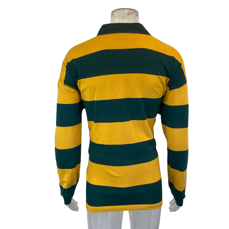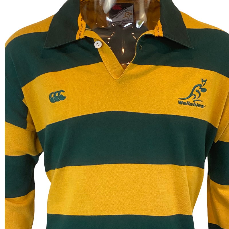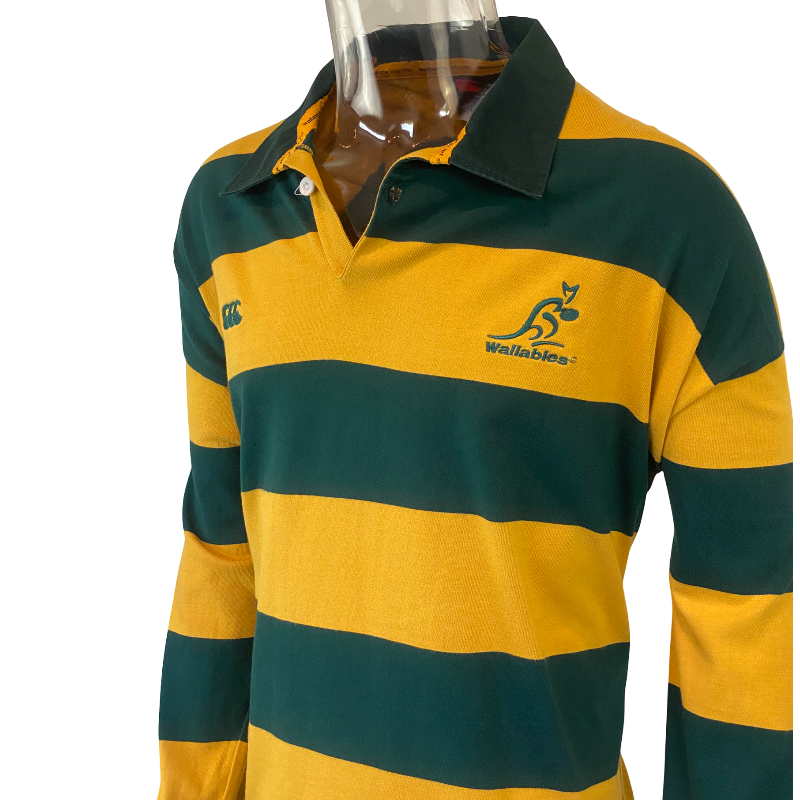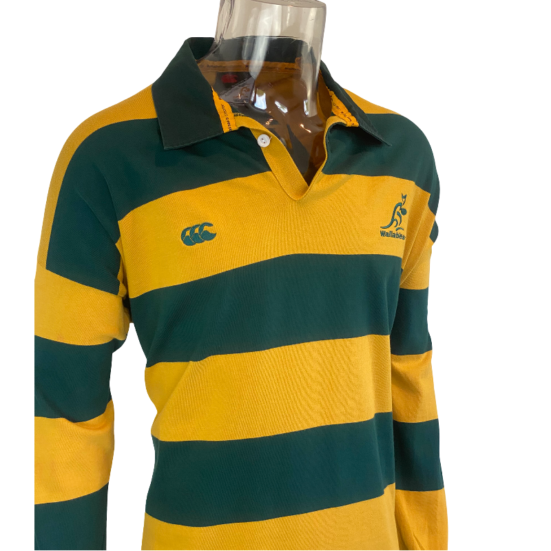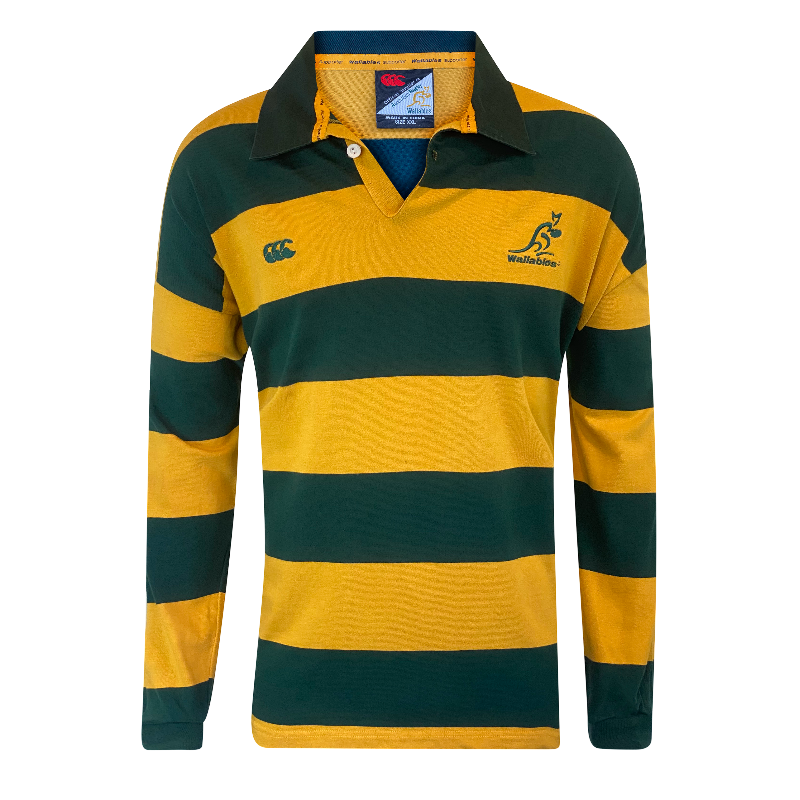 Bring back the golden era of Australian rugby with this classic 2003 Wallabies supporters jersey. Made by Canterbury, this design features the iconic green-and-gold hoops — a tribute to the much-loved 1995 Wallabies alternate jersey worn against Romania.