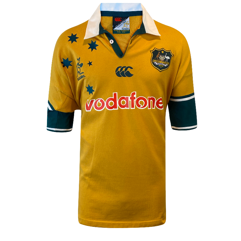 Vintage Wallabies jersey from the golden era of Australian rugby. This 2001 short sleeve CCC jersey is from the last time the Wallabies beat the All Blacks on New Zealand soil — and when they still held both the Rugby World Cup and the Bledisloe Cup.