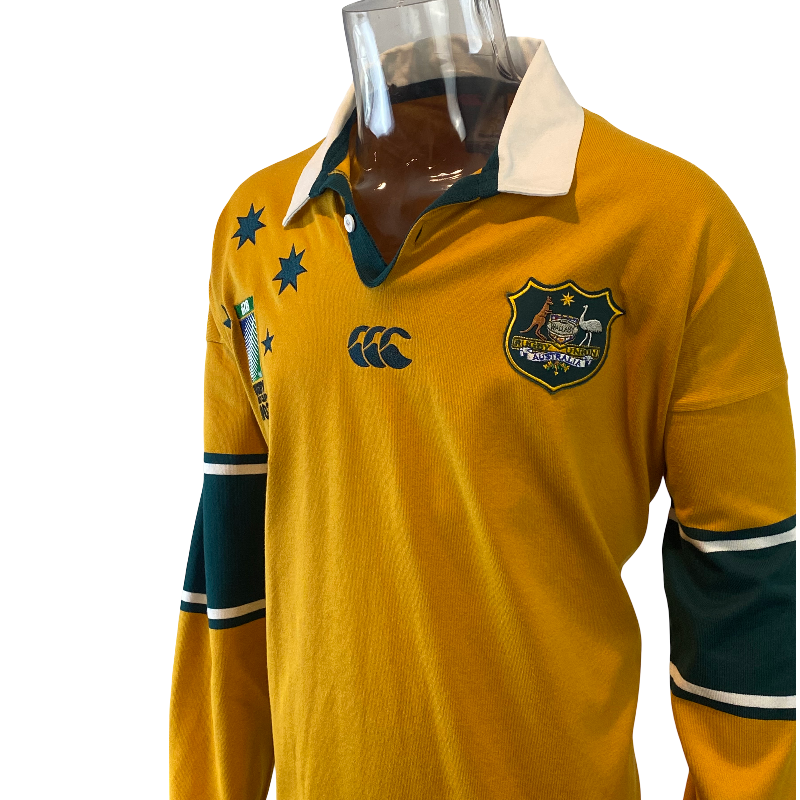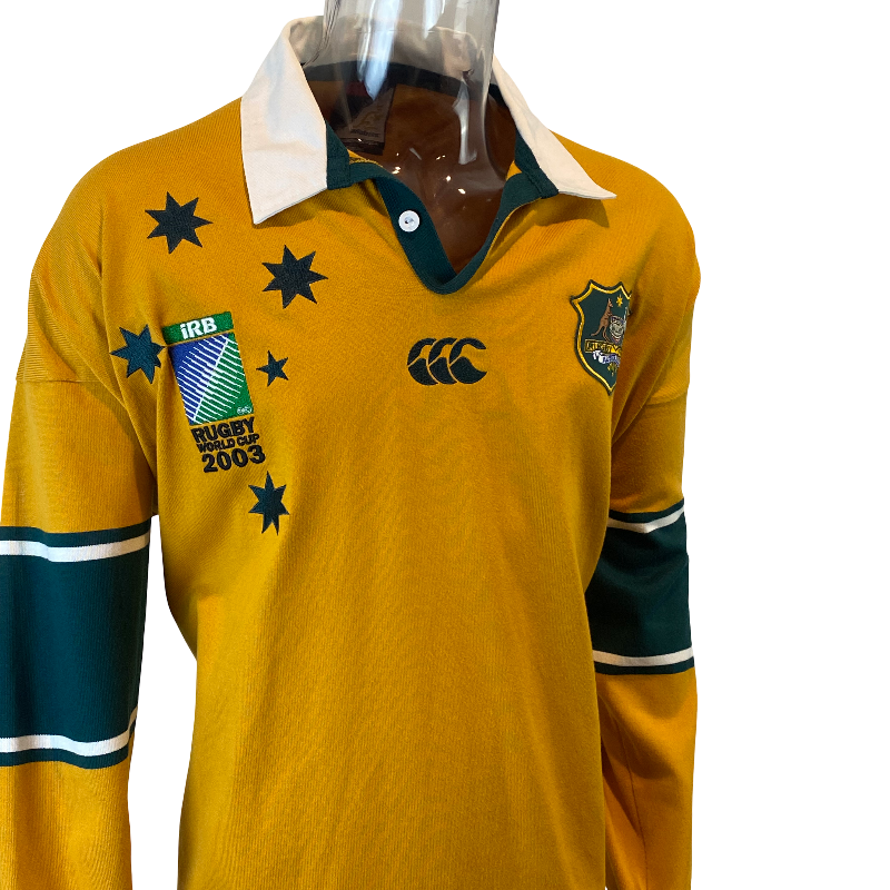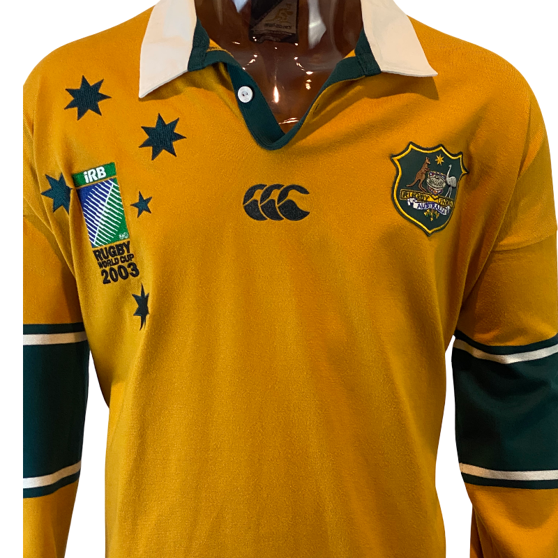 This 2003 Wallabies Rugby World Cup Jersey is a classic long sleeve design made by Canterbury of New Zealand. Worn during Australia’s memorable run to the Rugby World Cup Final, this version is particularly popular with fans for its clean look — free from front sponsor logos. It features the traditional gold colour and tournament detailing that defined that era of Wallabies rugby.