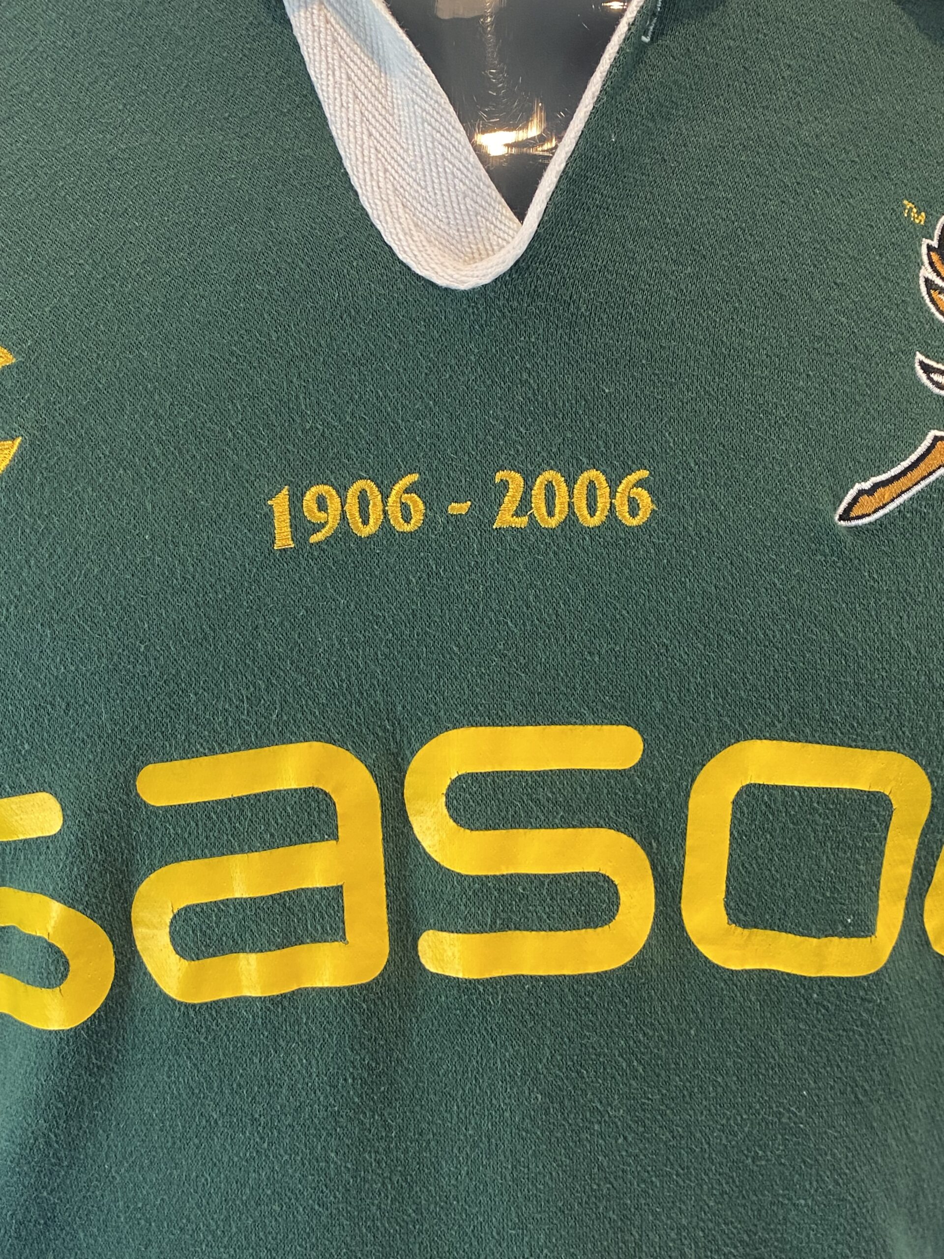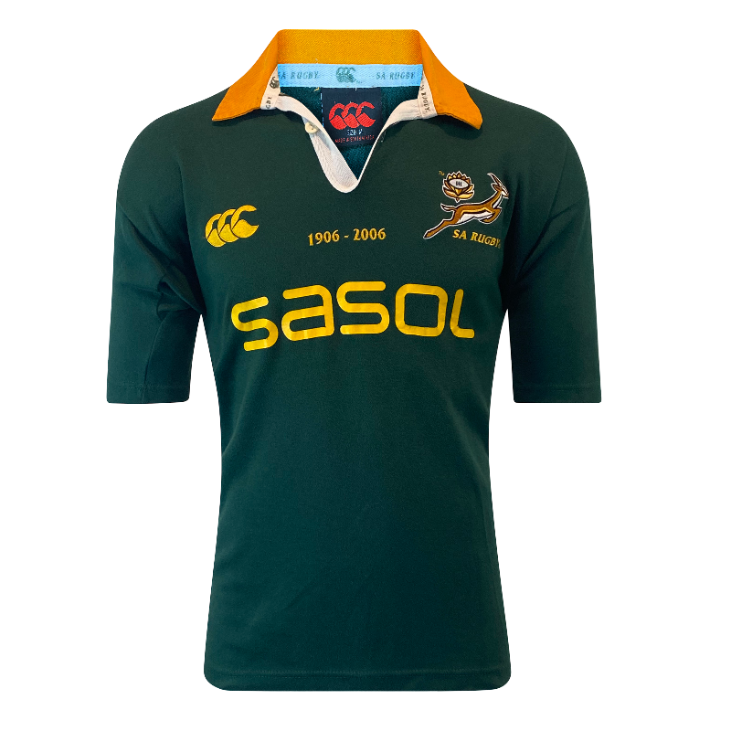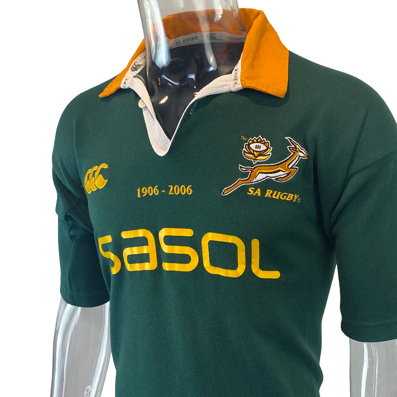 This 2006 Springboks Centenary Rugby Jersey by Canterbury of New Zealand was released to celebrate 100 years of South African rugby. Featuring the special 1906–2006 centenary embroidery above the Springbok logo and the South African flag on the sleeve, it is a fan favourite and one of the most sought-after modern Bok jerseys.