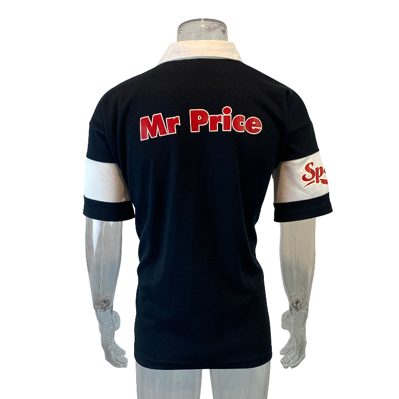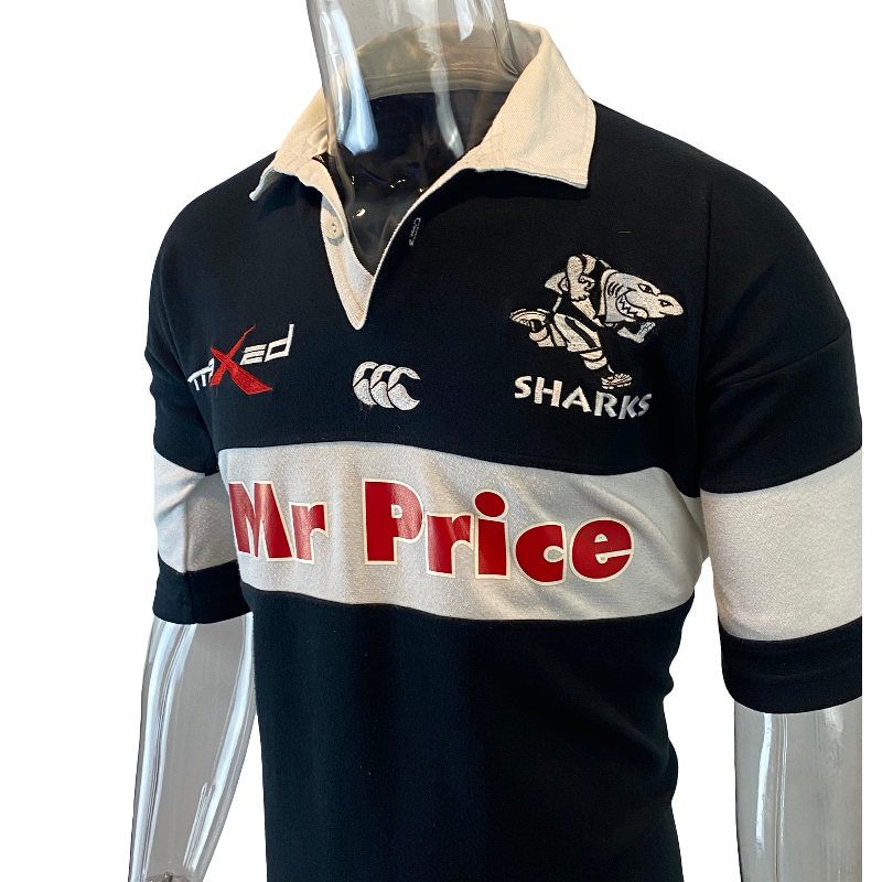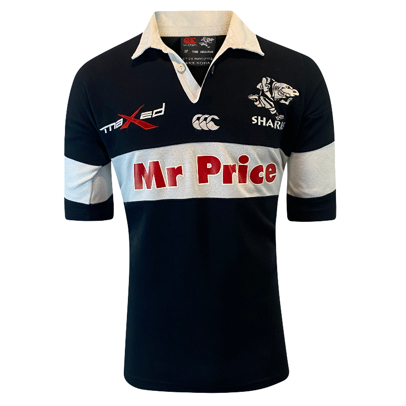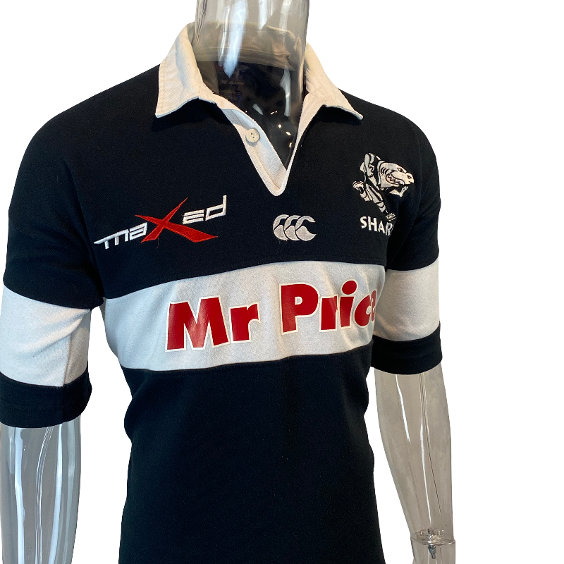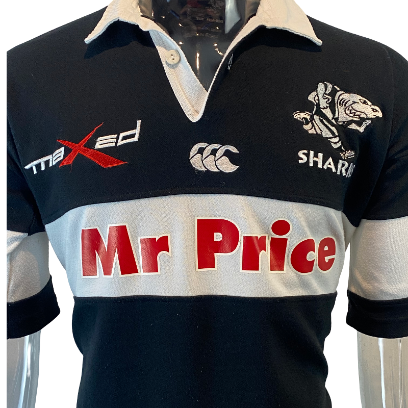 An awesome 2007 Sharks rugby jersey, made by Canterbury of New Zealand. This striking black-and-white design features the classic white collar and the Mr Price sponsor logo across the chest — a true throwback to Durban rugby style.