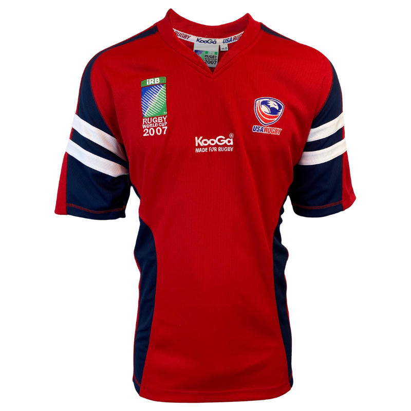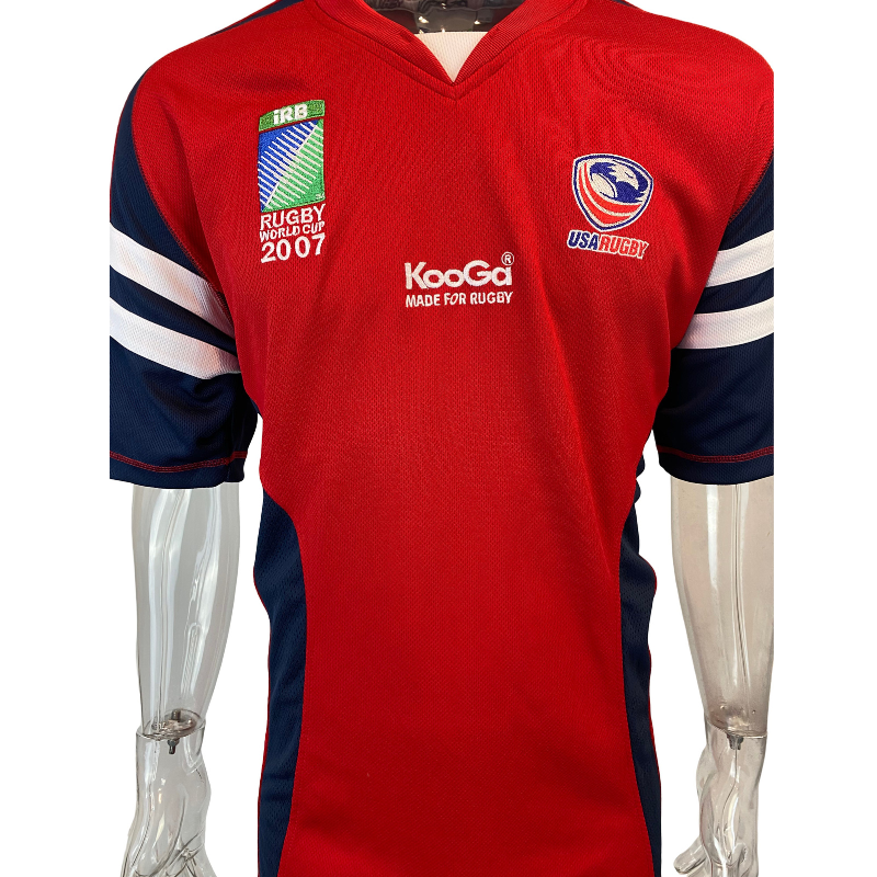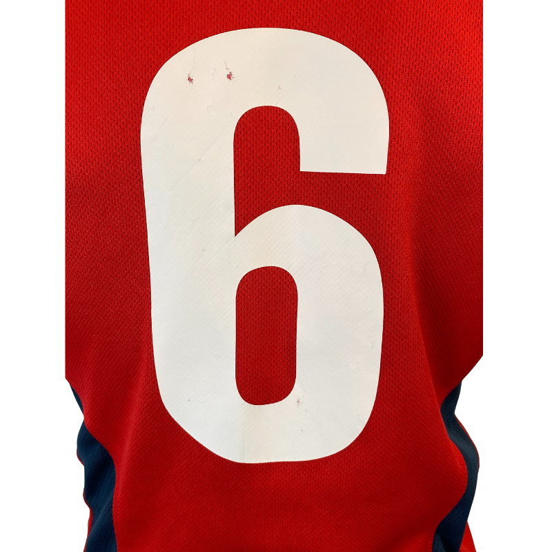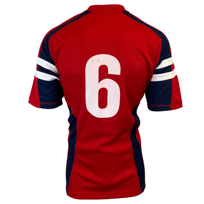 The USA Eagles have participated in most Rugby World Cups but have never advanced beyond the pool stage. The bright red jersey, made of 100% polyester, is striking in appearance. It features the number 6 on the back, matching the players’ jerseys, yet there is no indication that it is match worn. Manufactured by Kooga.