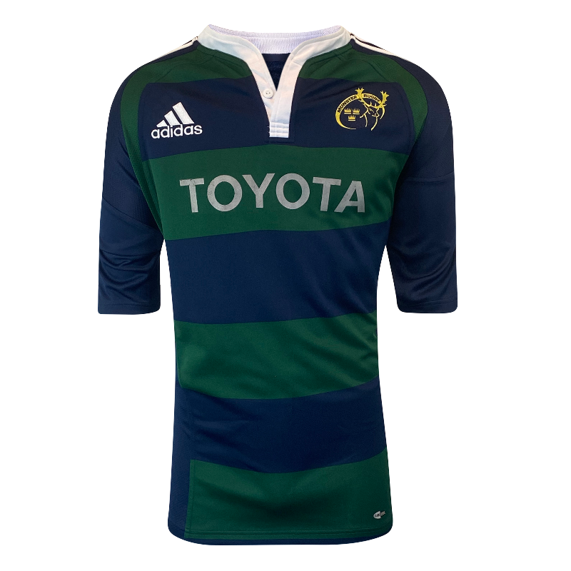 This 2007 Munster training jersey by Adidas is a seriously big unit, tagged XXL but easily fitting up to a 3XL thanks to its generous cut and classic mid-2000s training fit. It features a distinctive colour combination that really sets it apart from standard Munster designs of the era, along with the bold Toyota sponsor across the front.