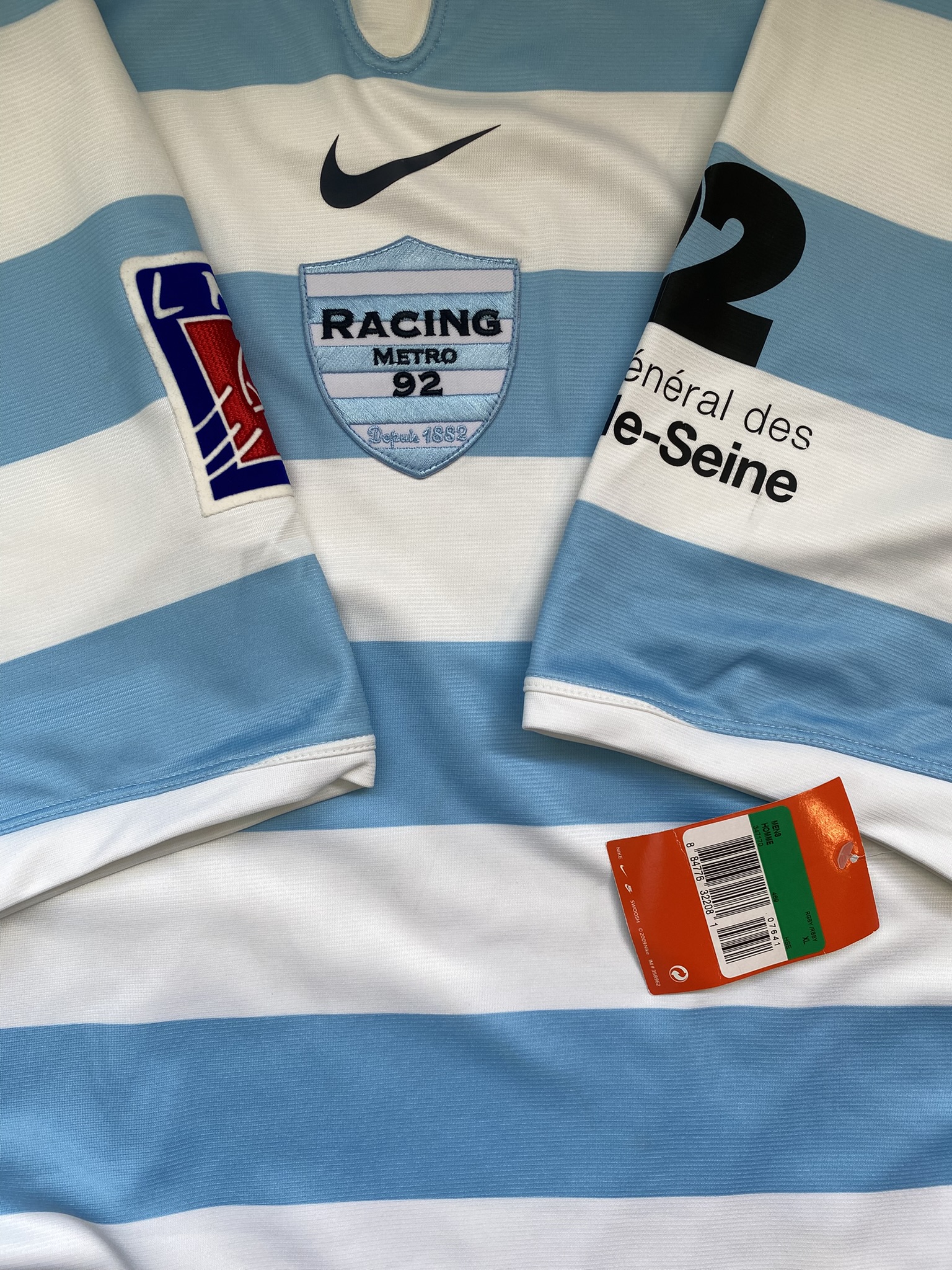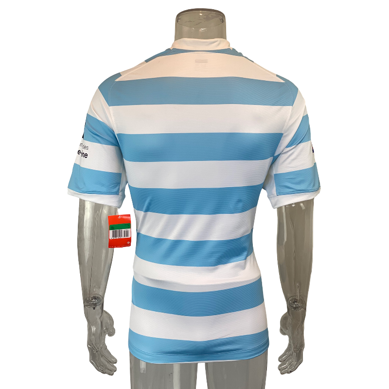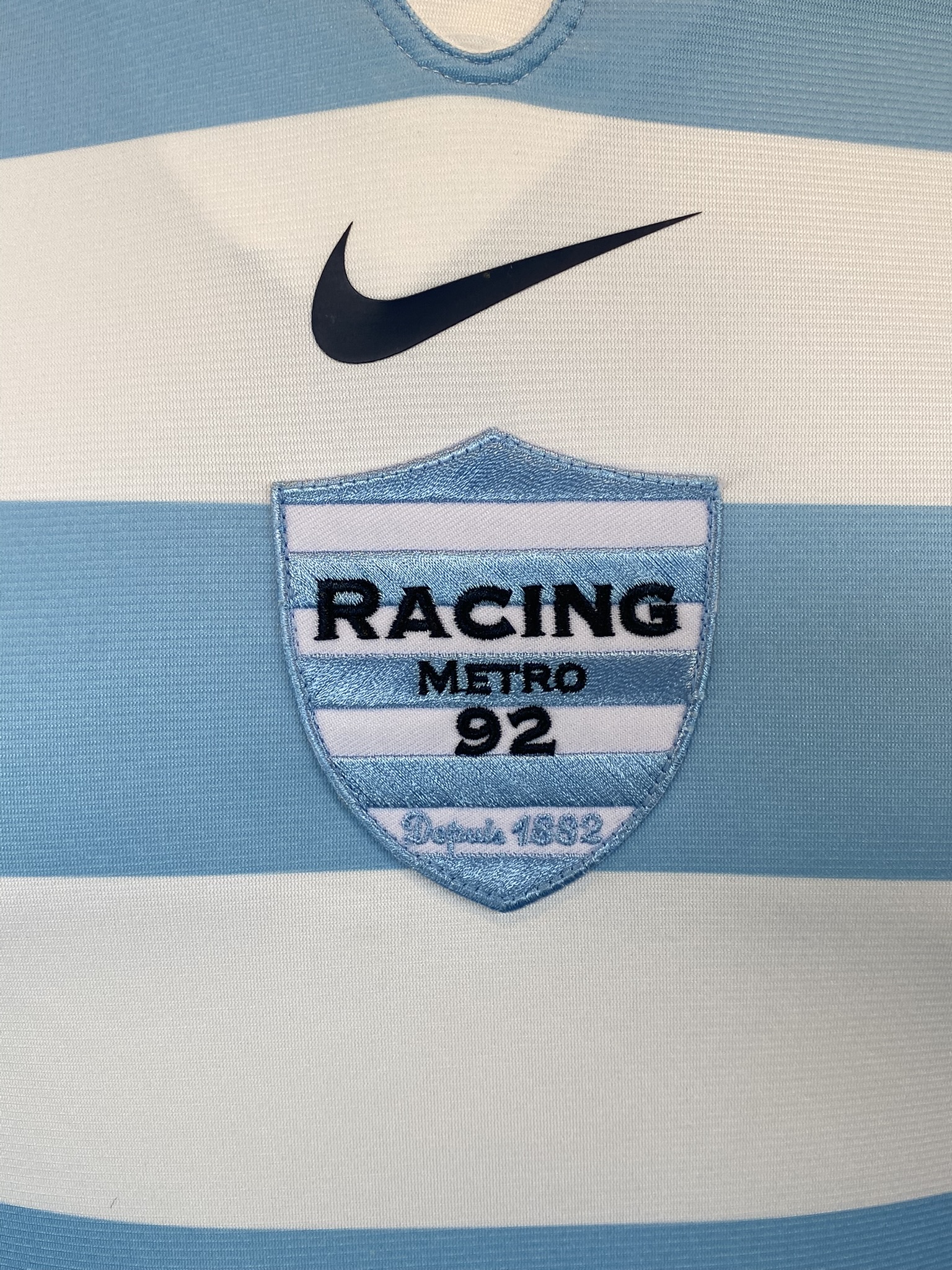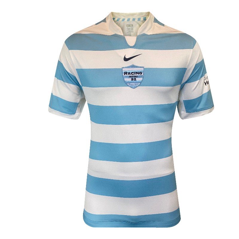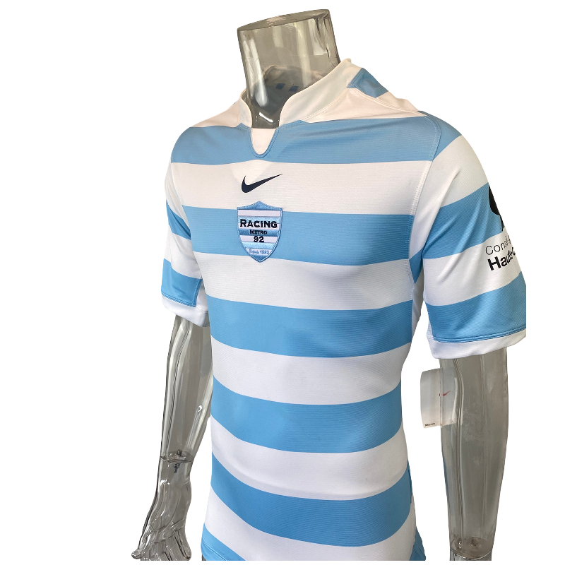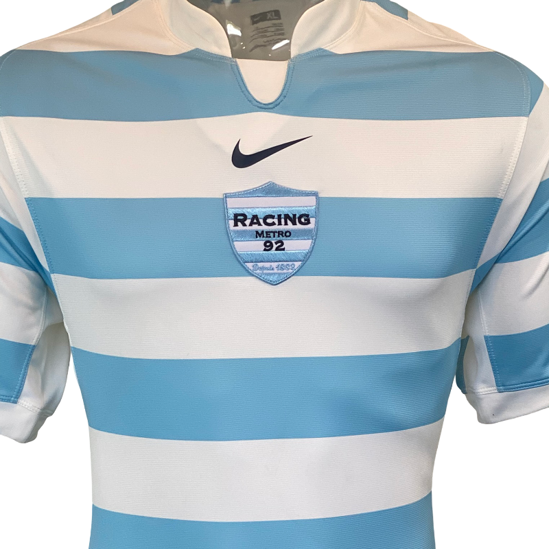 A striking 2009 Racing 92 Pro rugby shirt produced by Nike, featuring the club’s iconic sky blue and white hooped colour scheme. This is the official Pro version, designed to the player specification used during the season, with a close, athletic fit and lightweight performance fabric.