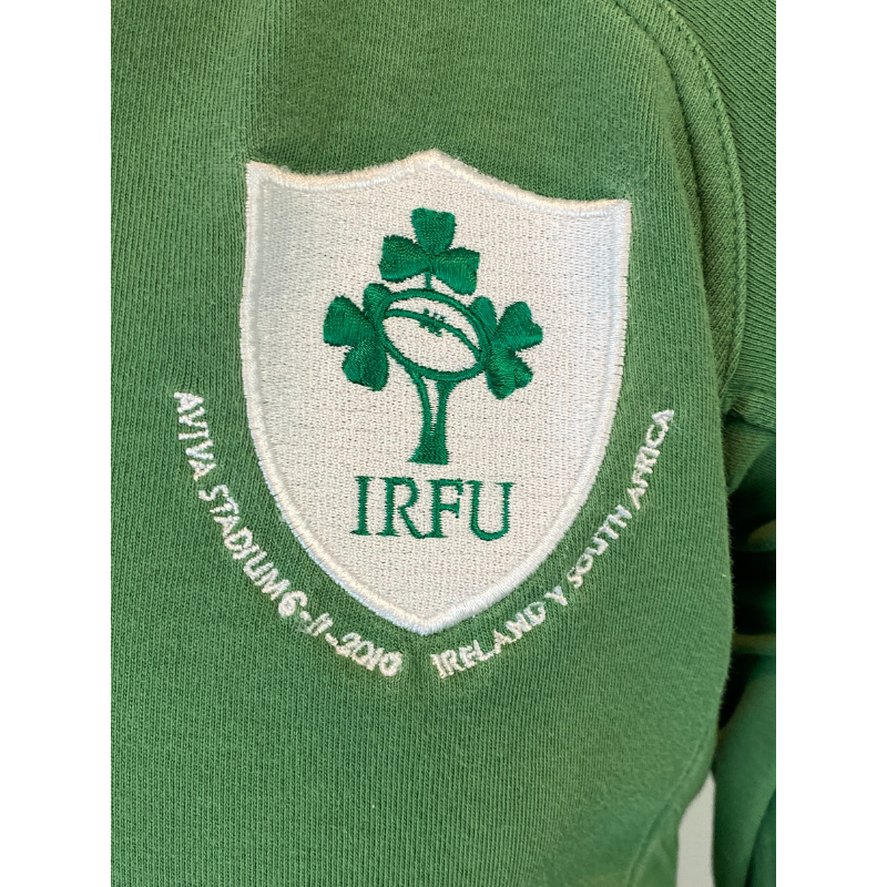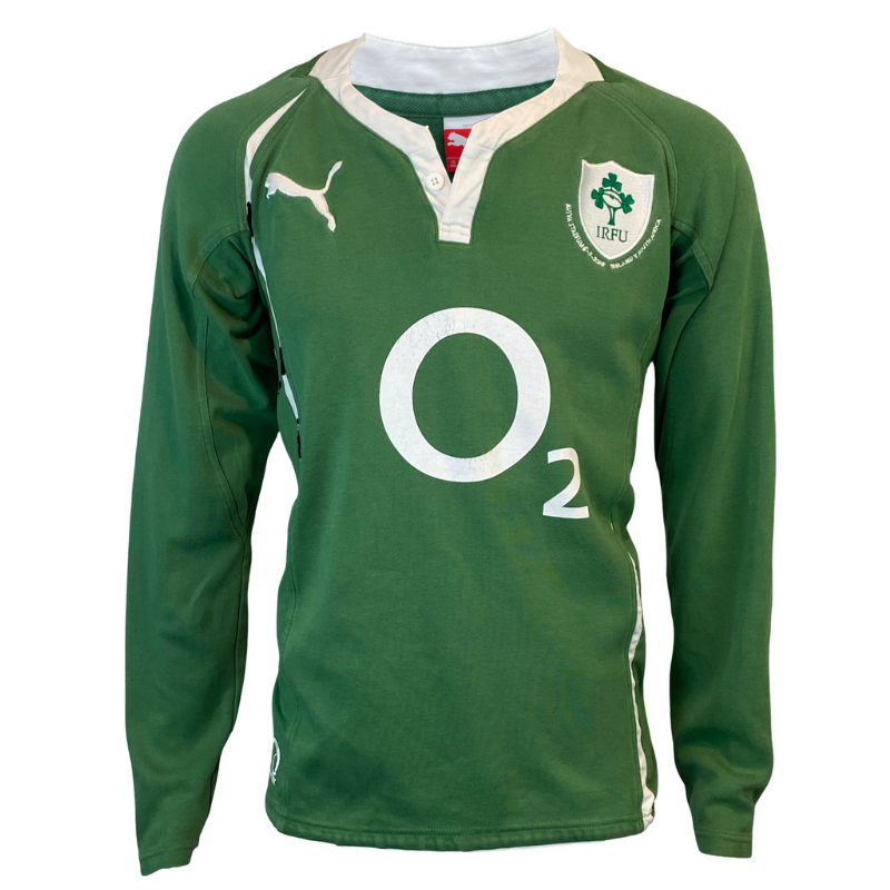 This jersey, unveiled to commemorate the opening test match at Aviva Stadium, features game day embroidery uncommon for replica jerseys. Although aesthetically pleasing, the game version proved fragile during play, frequently tearing and needing replaced at half-time. Manufactured by Puma.