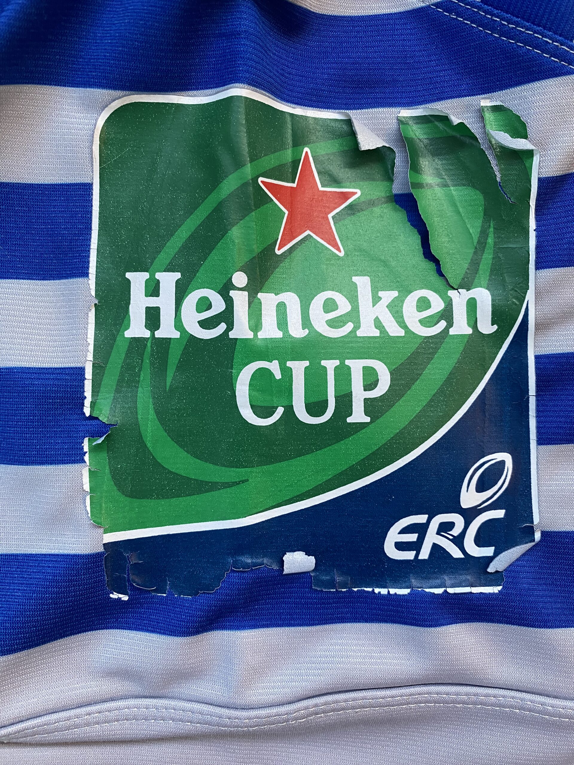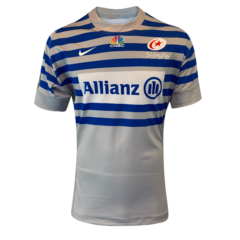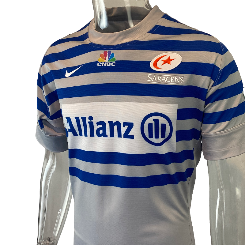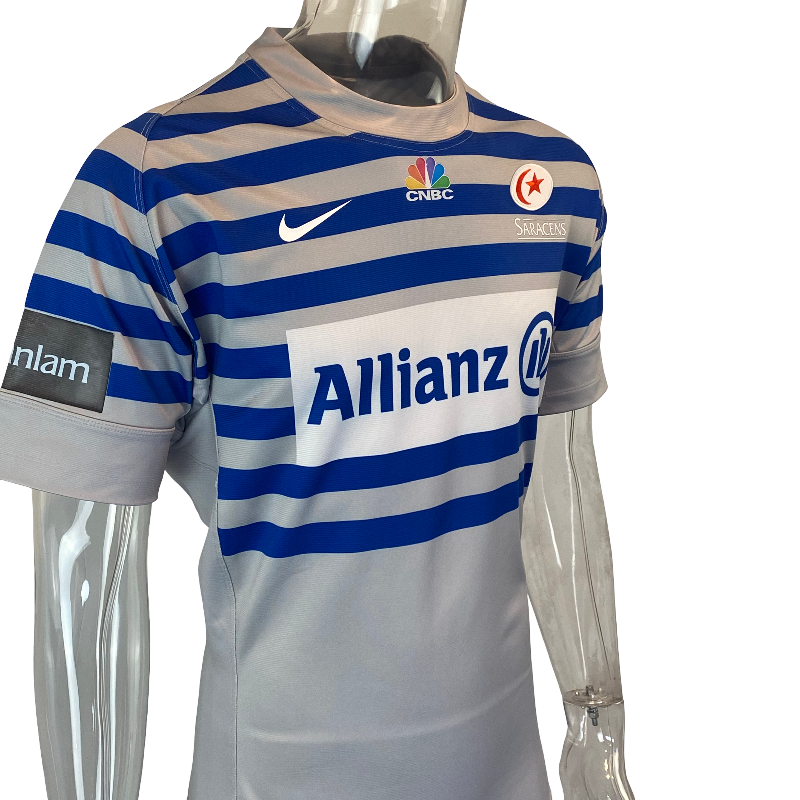 Made by Nike, it includes all sponsor logos and competition detailing, giving it a genuine professional look and feel. The jersey is in excellent overall condition, with the only flaw being some light wear to the Heineken Cup patch on the sleeve. A rare and unique piece for Saracens fans and collectors looking for authentic player-issue gear.