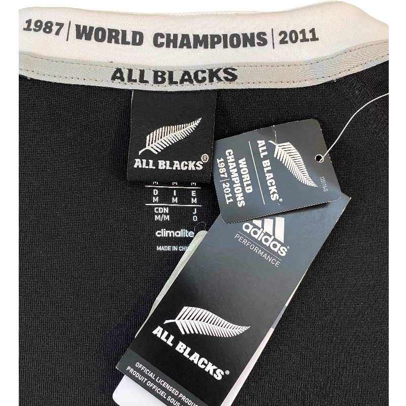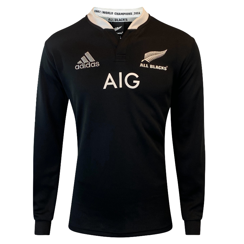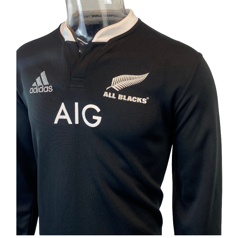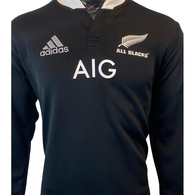 This is the All Blacks 2013 perfect season jersey. This jersey was the first jersey to feature a prominent sponsors logo across the front. The AIG logo on the front caused a lot of controversy at the time as up till then had only ever had a small Steinlager logo from 1994 to 1998. This jersey also saw a return of a full white collar. This jersey is in perfect condition still with original tags attached and in the rarer long sleeve version.