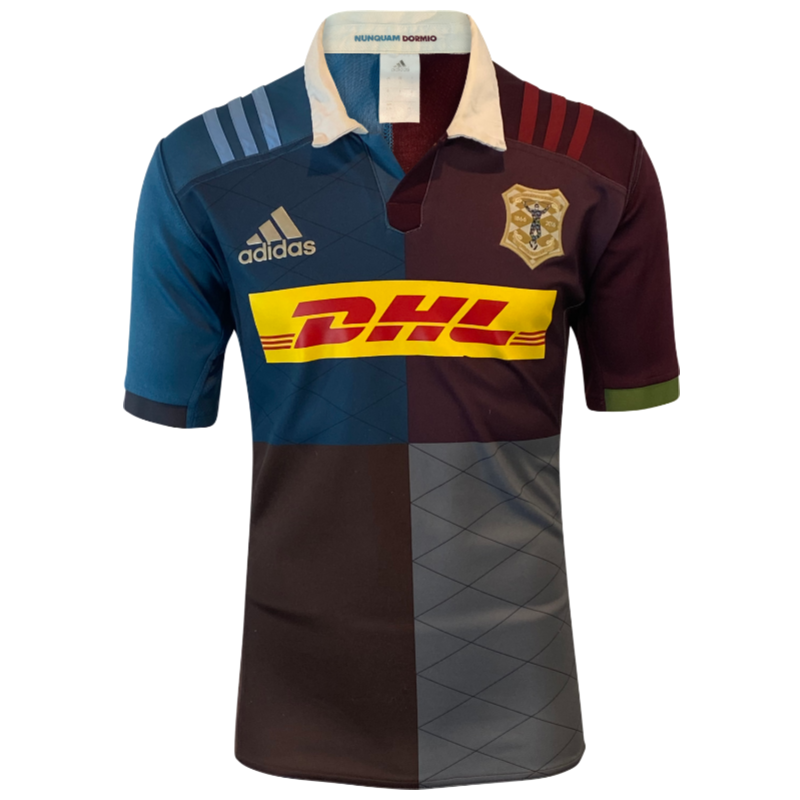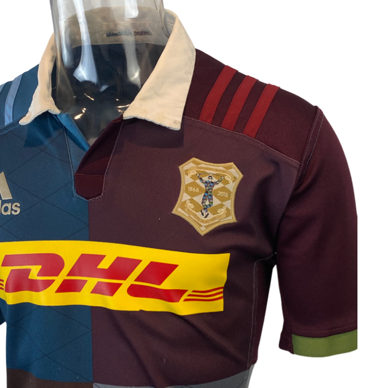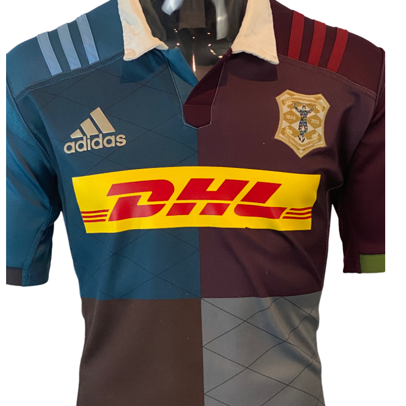 This is a 2016 Harlequin’s jersey to commemorate 150 years as a club. Made by Adidas its a high-quality jersey and excellent design. The jersey is in excellent condition with only flaw being a couple pulls on the front of the jersey. This jersey would fit between medium and large. These 150-year jerseys are incredibly popular so here is a great opportunity to land one now if missed out back in 2016.