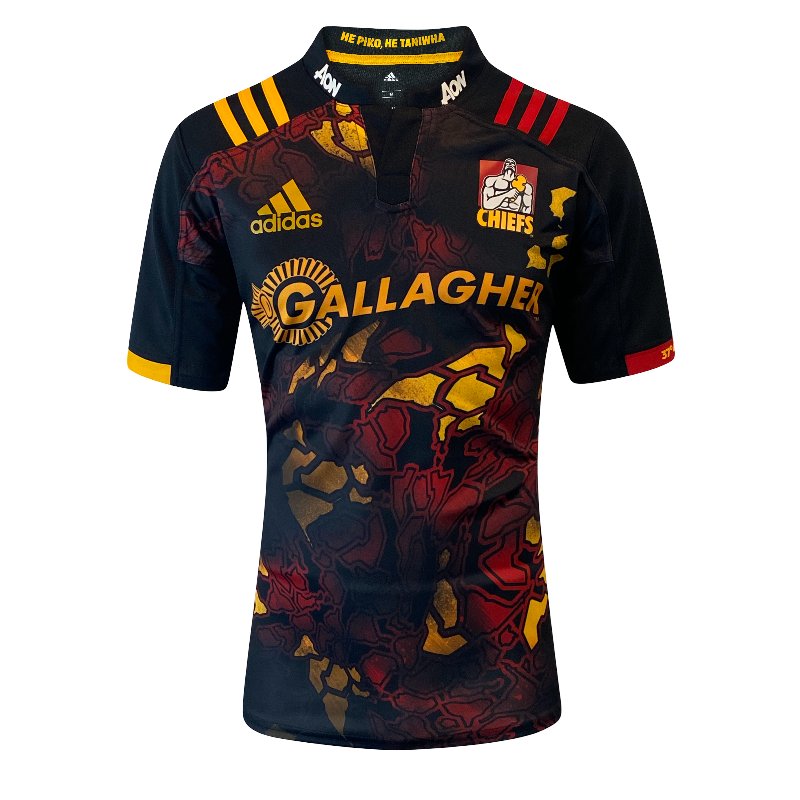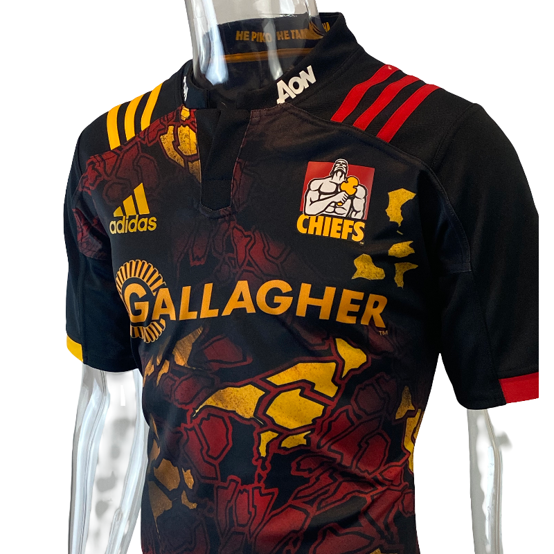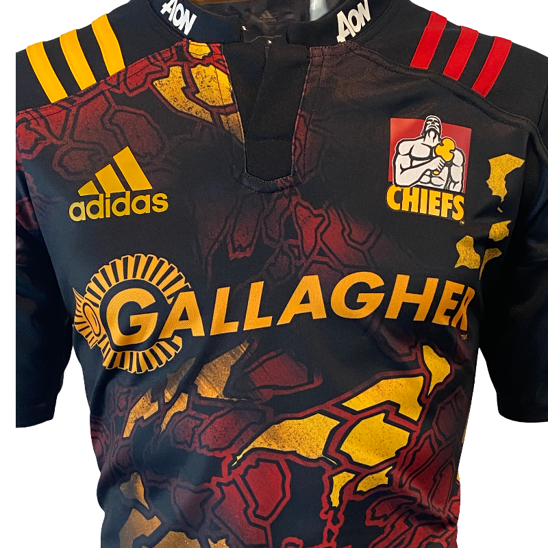 A unique one-off design, this 2017 Chiefs “Territory” rugby jersey was released specially for the British & Irish Lions tour to New Zealand. Worn in the historic midweek clash against the Lions, the Chiefs fielded a depleted side with their All Blacks away on test duty, falling 34–6 in Hamilton.