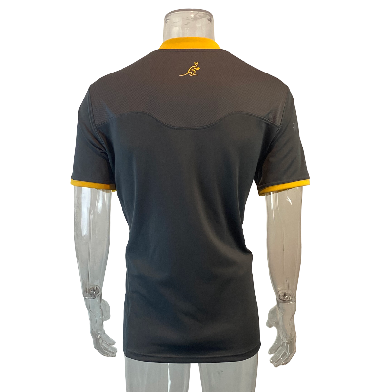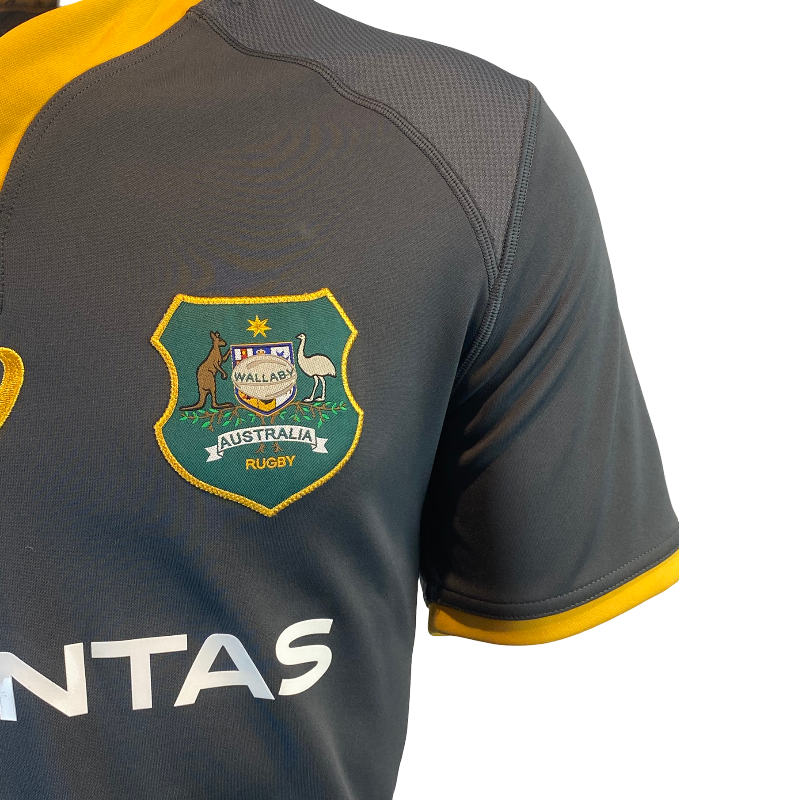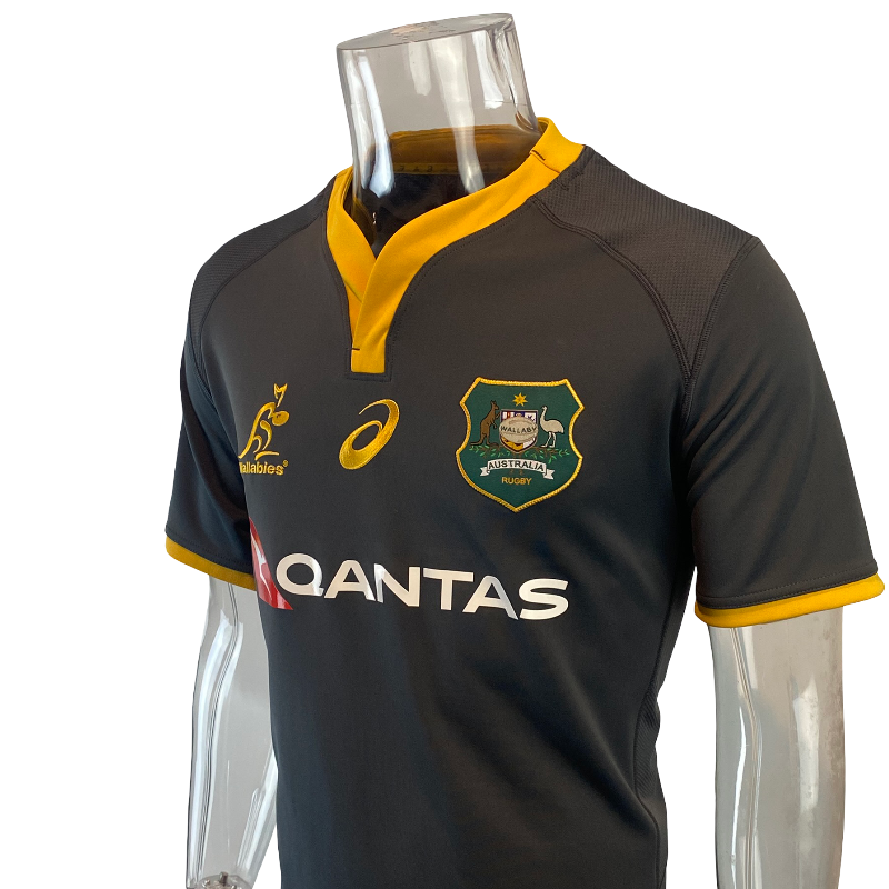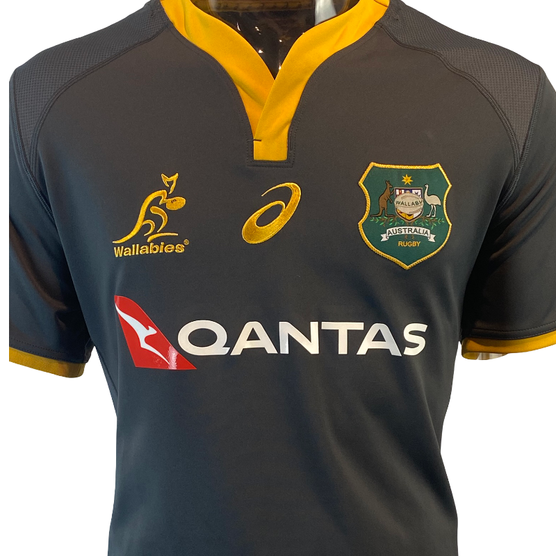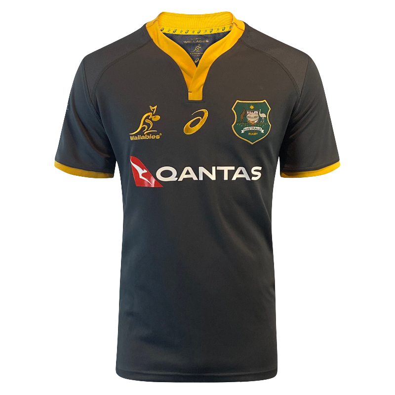 Teams often take the opportunity with training gear to experiment beyond their traditional match colours, and this 2019 Wallabies training jersey is a perfect example. Produced by ASICS, the jersey features a striking dark charcoal design with gold detailing that almost gives off an All Blacks-style aesthetic while still proudly representing Australia. With the classic Wallabies crest and Qantas sponsor across the chest, this is a unique piece that stands out from the standard gold match jerseys.