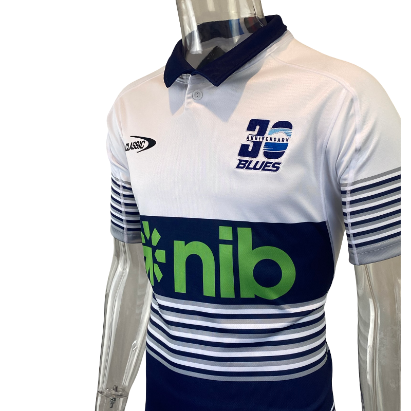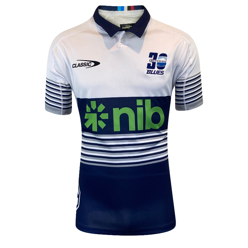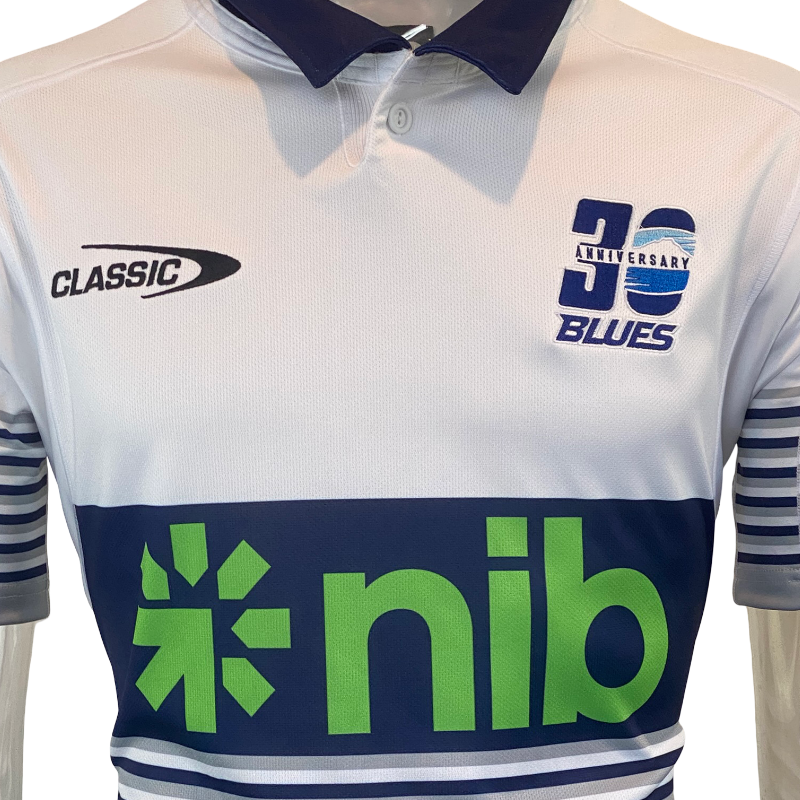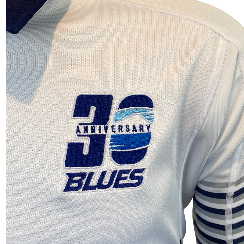 The jersey includes exclusive 30th anniversary detailing on the chest and a commemorative sleeve patch, creating a true collector’s item for Blues fans and Super Rugby nostalgics.