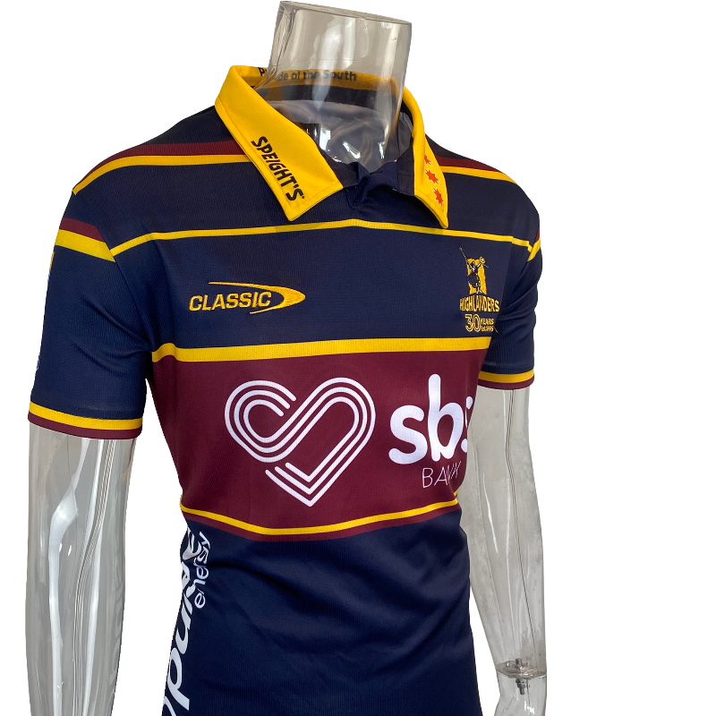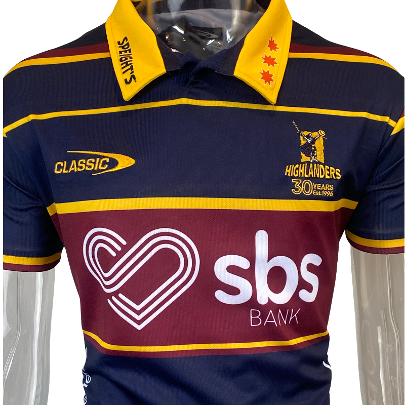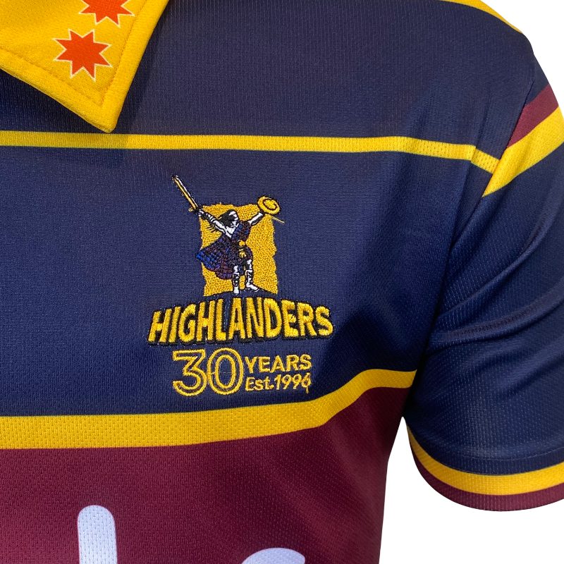 The jersey includes exclusive 30th anniversary detailing on the chest and a commemorative sleeve patch, creating a true collector’s item for Highlanders fans and Super Rugby nostalgics.