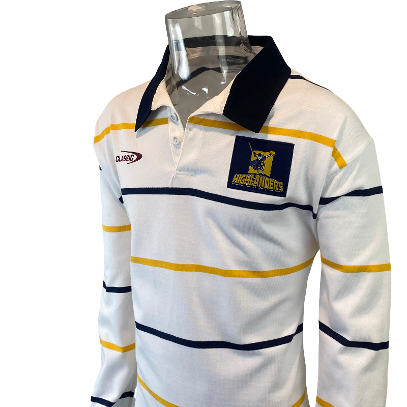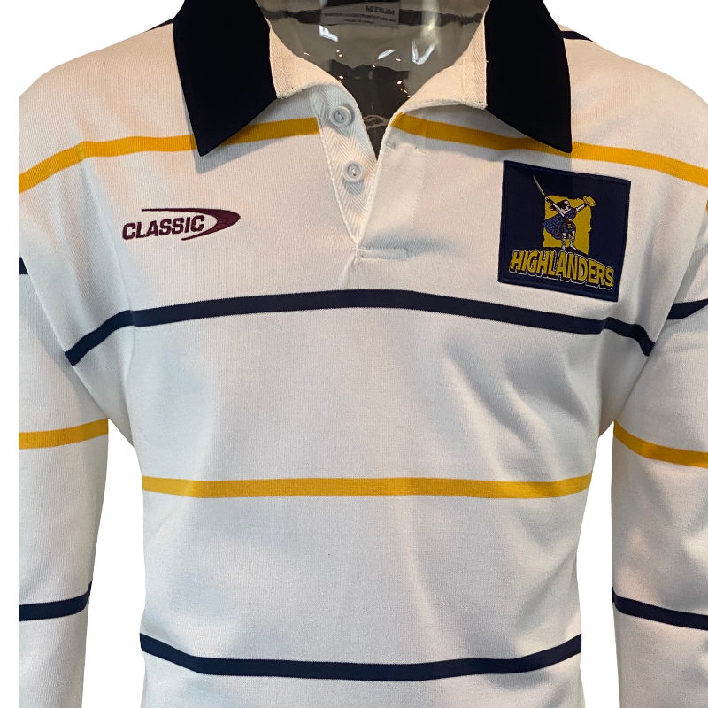 Produced as a traditional knit jersey, this is a premium, heavyweight piece designed for comfort, warmth, and durability. Featuring the classic hooped design, embroidered Highlanders crest, and long sleeves, it blends old-school rugby styling with modern construction.