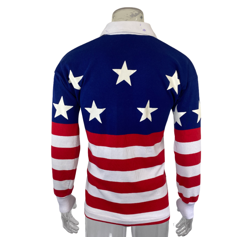 This iconic USA jersey first emerged in the late 1980s during the America’s Cup and is best remembered for its appearance at the 1993 Sydney Sevens, worn by the USA team. This jersey while tagged XL fits Medium and is in very good condition. Only flaw is some dye run showing on the white collar.